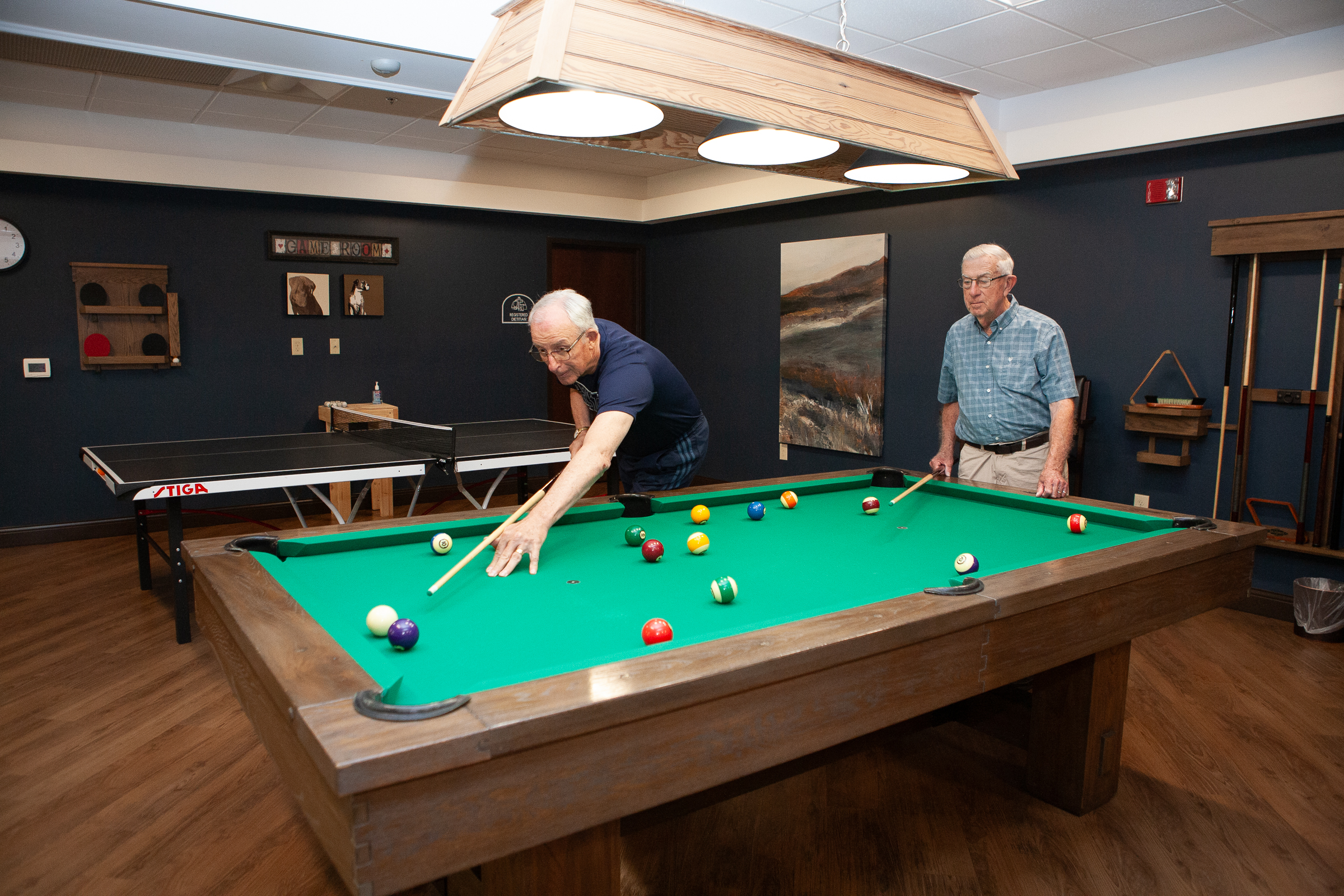 Residents with an artistic flare can be found in our Village Art Center located right around the corner from our Business Office. Many levels of art students are always hard at play, creating masterpieces to be displayed on our Artist in Action Wall located near the DiMatteo Worship Center. Every week you will also see neighbors having fun playing all kinds of card games together or maybe playing a game of pool in the Billiards Room.